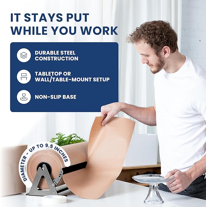- Roll Compatibility: Fits rolls up to 18'' wide, max 9'' diameter (equivalent to 1000ft on a 1'' core). Be sure to insert your paper with the loose end over the top; butcher paper, construction paper, brown paper, or craft paper may be used