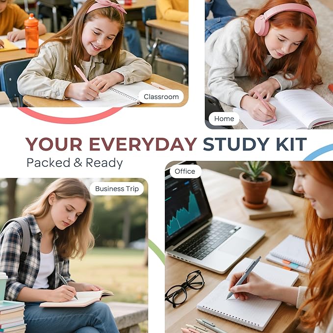 - Comprehensive Stationery Set: This pack includes everything you need for writing, highlighting, and organizing your study or work materials. The set contains 12 pastelcolored highlighters, 6 mechanical pencils, 5 black gel pens with 5 additional refills, 3 erasers with 18 eraser refills, 6 tubes of mechanical pencil lead refills, and a durable fabric pencil pouch
