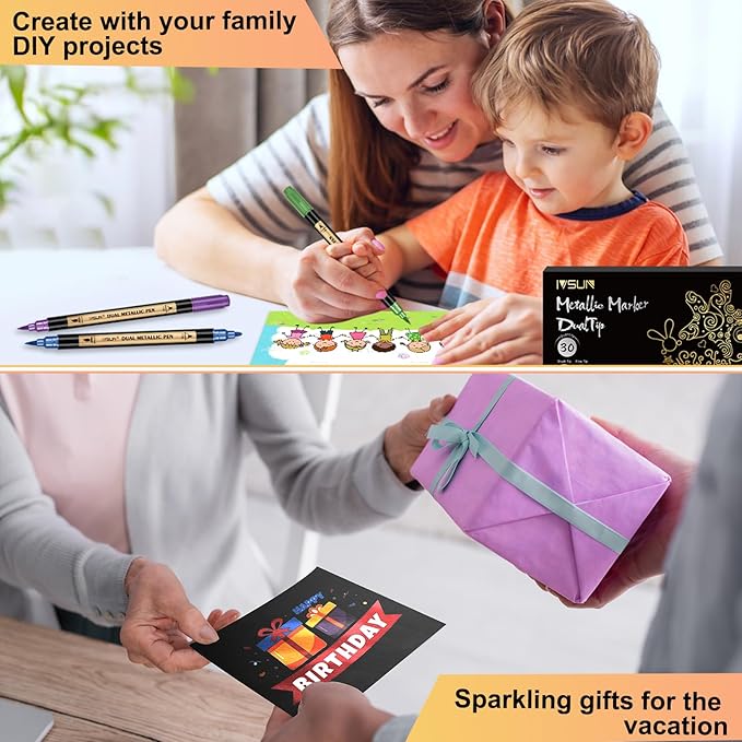 Metallic Marker Pens, 30 Colors Dual Tip Acrylic Paint Pens for Black Paper, Scrapbooking, Photo Album, Rock Painting, Paint Marker for DIY Arts & Crafts, Glass, Wood, Card Making, Scrapbook Supplies