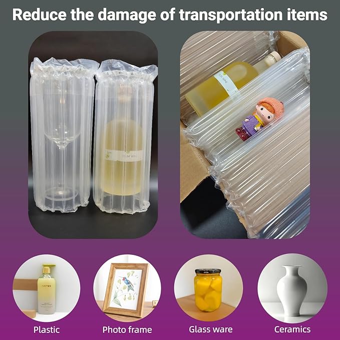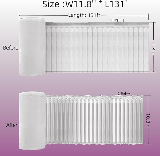 - 【Size & Package】: Our packing air pillows comes with a hand pump(random color). Size: 11.8 inches by 131.2 feet. Each air column measures 1.18 inches × 11.8 inches before inflation; after inflation, each air column measures 0.8 inches × 10.8 inches. This versatile packing pillows can be cut to any length you need. The air pockets effectively distribute weight and minimizes impact, providing wrapping, padding and box filling, safeguarding your belongings from damage