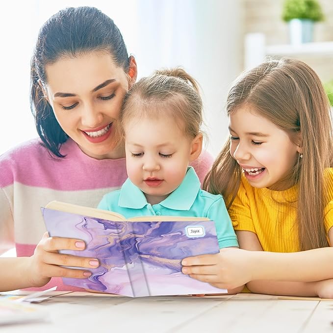 - Book cover kit: This pack comes with 8pcs stretchable book covers in different marble print styles, along with a sheet of name tag labels. These jumbo book covers fit books measuring 9x11 inches and can stretch up to 10x12.5 inches.
