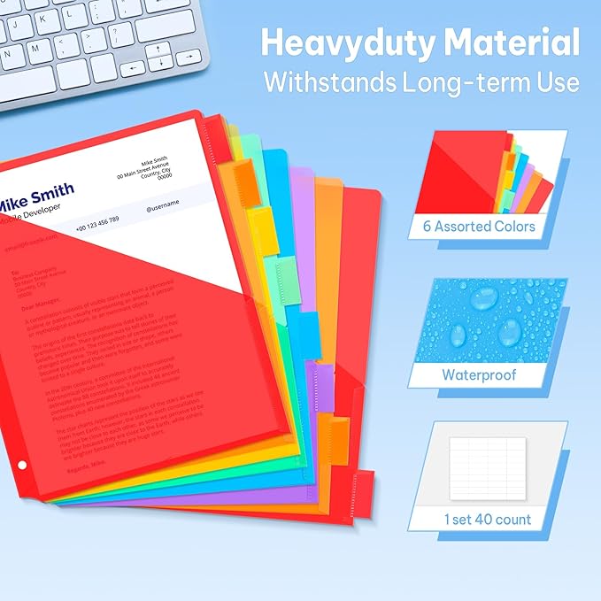 - Durable Plastic: Our binder dividers made from tear-resistant plastic, these dividers withstand frequent handling without bending or wear. The sturdy material supports heavier documents, offering reliable protection to keep your papers intact throughout the school or work year.