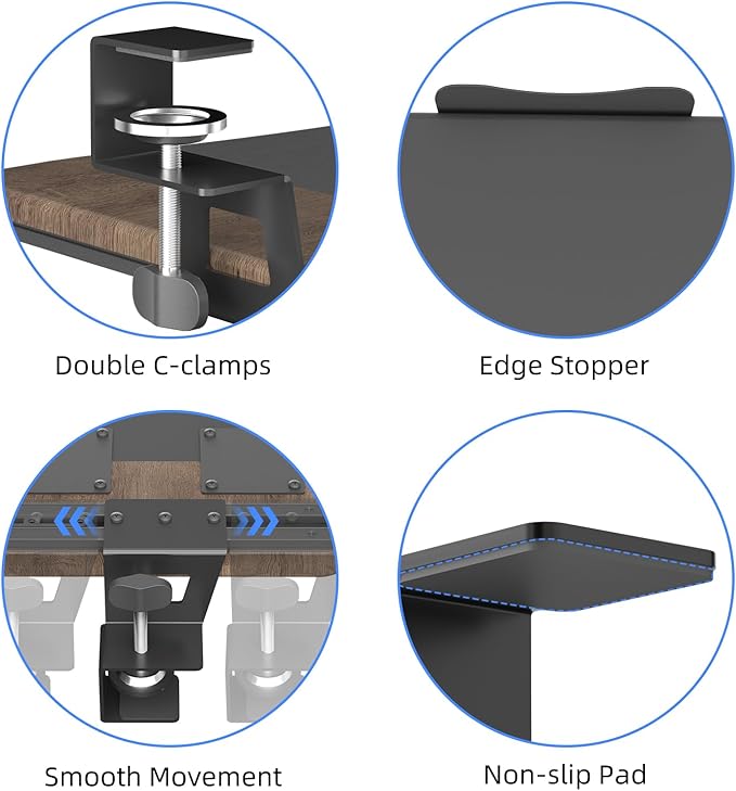 - Sturdy - Dual Steel C-clamps can tightly fix to your desk and holds up to 11lbs. Non-slip pads prevent your desk from scratching. Edge stopper can stop keyboard from falling when pushing back.