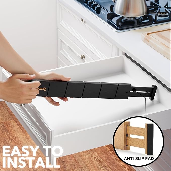 - Drawer Dividers That Stay in Place: Strong spring-loaded design makes them sturdy dividers, with non-slip rubber pads in the end, keeping it stay put all the time and protect your drawers from scratches