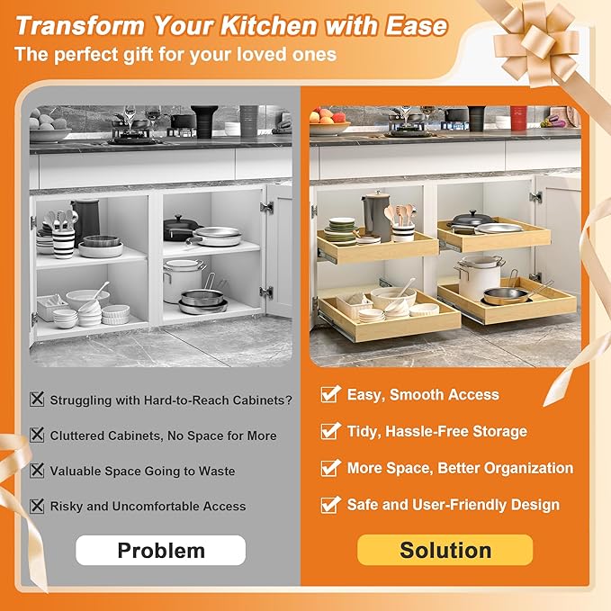 - Solid Birch & Food-Safe Finish: Crafted from high-density cold-climate birch with a multi-ply bottom panel, this pullout drawer for kitchen cabinet is built to last. Finished in a Zero-VOC water-based clear coat that’s safe for food and family use—ideal for storing cookware, pantry items, and utensils
