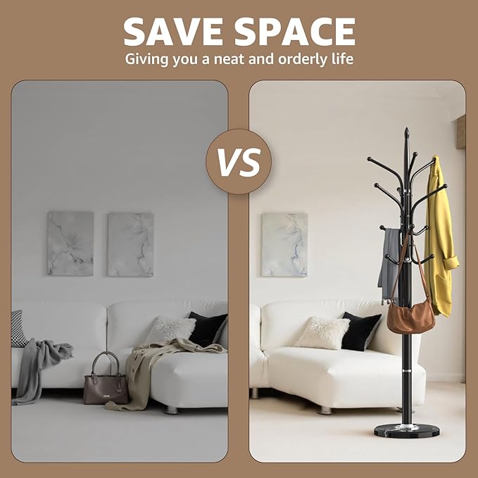 - 【Versatile】:HzTinT coat rack stand is 13"W x 71"H, occupying the smallest space in the entryway, office, living room, entry hall, corner, bedroom, bathroom, apartment, or any corner! With 12 sturdy hooks on the coat tree freestanding, it can easily accommodate various heavy coats, scarves, hats, backpacks, handbags, wallets, suits, jackets, and more.