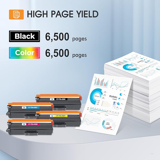- High Page Yield: Up to 6,500 pages per TN436BK toner cartridge (Letter A4, at 5% Coverage), Up to 6,500 pages per TN436C TN436M TN436Y toner cartridge (Letter A4, at 5% Coverage)