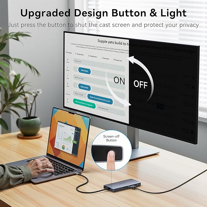 - Screen Switch Button + Smart Status Lights: Laptop Docking Station dual monitor equipped with a screen switching adjustment button, which can quickly turn off or wake up your monitor, save power consumption and protect your privacy. With the smart detection light, you can quickly check if the USB C Dock is compatible with your laptop