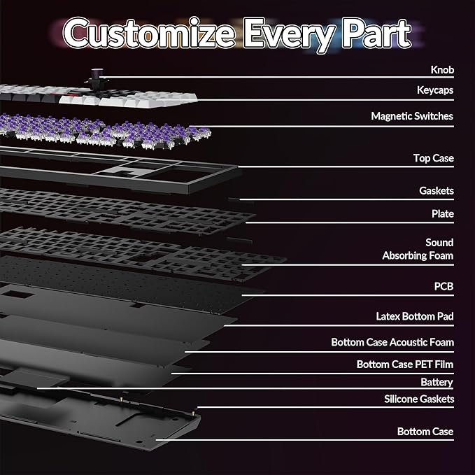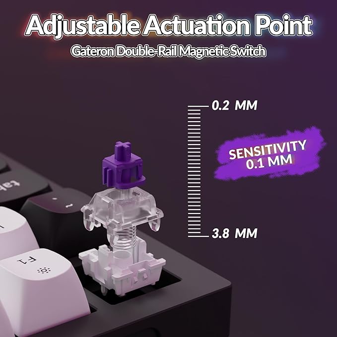 - Adjustable Actuation Point & Analog Mode Fine-tune each key's actuation from 0.2 to 3.8 mm with 0.1 mm sensitivity for precision. Analog mode converts key press depth into variable speeds or intensities, perfect for racing and sports games, offering nuanced control for a dynamic experience.
