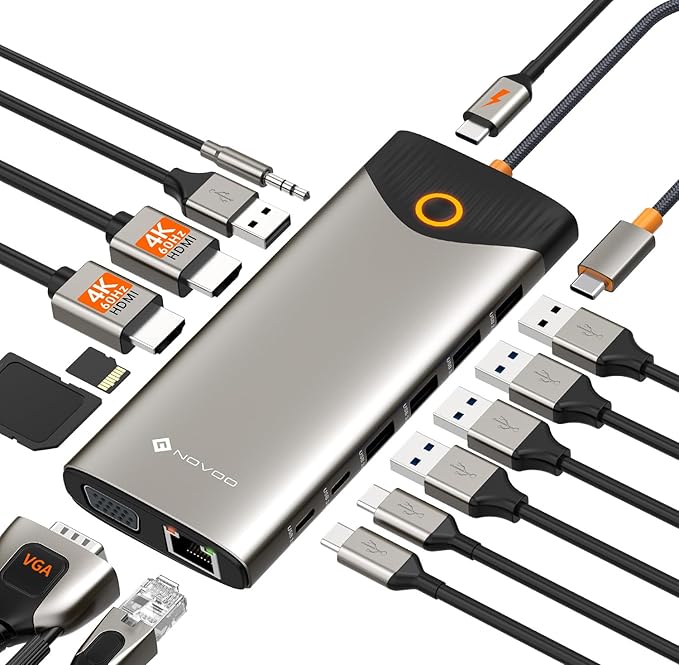 - 15 in 1 USB C Docking Station: NOVOO USB C HDMI Multi-Port hub with Screen Switch, Dual 4K HDMI Ports, 2*USB-C 3.0 Data Ports (Up to 5Gbps), 1*USB C PD100W charging port, 3*USB-A 3.0 Ports, 2*USB-A 2.0 Ports, Gigabit RJ45 Ethernet, VGA, SD/Micro SD Card Reader and 3.5mm Audio/Mic Port. Plug and play for your many needs.