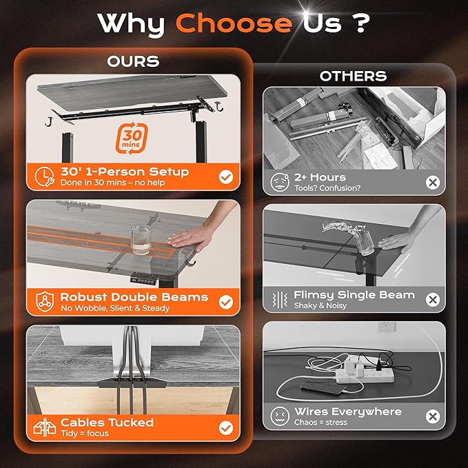- 【Built to Last with Exceptional Stability】The industrial-grade steel frame and T-shaped design of the stand up desk support up to 220 lbs, ensuring stability and reliability for years to come. Paired with a durable motor, this home office desk is designed to meet the demands of your dynamic workday