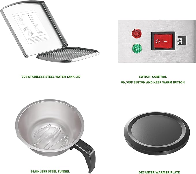 - [COMMERCIAL GRADE STAINLESS STEEL COFFEE MACHINE]: This office coffee maker made from food-safe materials. Comes with a 304 SUS tank lid, removable funnel, boiler, and a stainless steel machine housing. Resistant to heat, rust and stains. The restaurant coffee machine can withstand continuous daily use in commercial Setting
