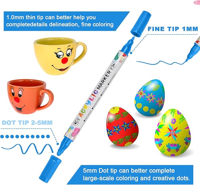 - Multi purpose Dual Tip Acrylic Paint Pens with Fine and Dot Tips ---- Each kEMYR pen is equipped with a 1-5 mm dot tip for filling large areas and bold points, and a 1 mm fine tip for lines and details work.