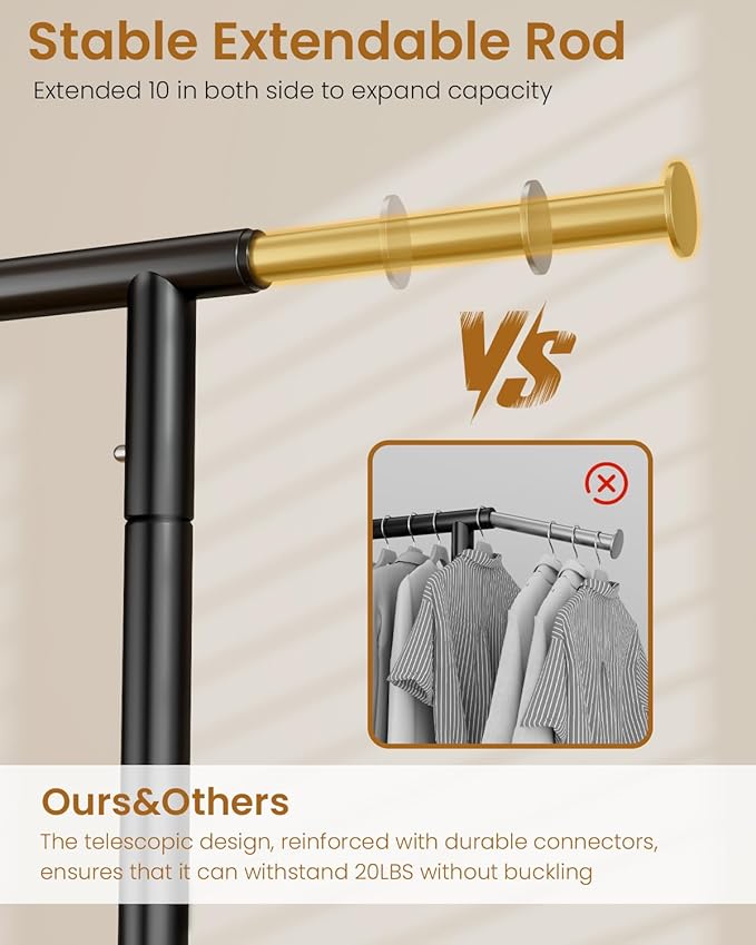 - š¼šæš šššš¼š½šš šššššš: The heavy duty clothes rack features a user - friendly adjustable design. The horizontal rod extends from 43in to 63in. This adaptability makes it perfect for any space such as living room, bedroom, laundry, yard sales, clothing live streaming, shopping malls and so on.