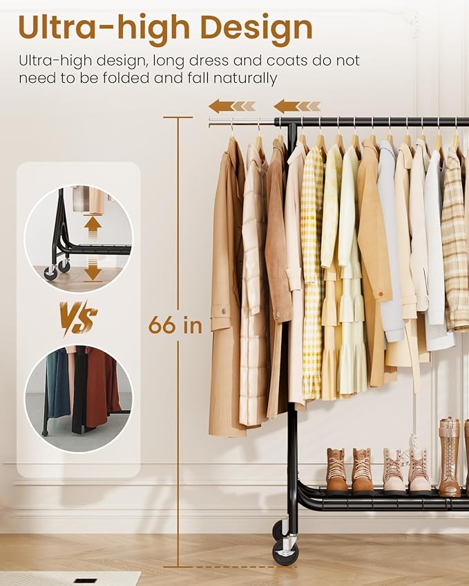 - šššššæš š¼ššæ ššš¼š½šš š¾ššššššš¾šššš: Our clothes rack adopts an innovative one-piece rod design, which ensures that the clothing rack are evenly supported, preventing sagging or bending. The triangle on the sides and dual U-shade rods on the bottom make the heavy duty clothing rack more stable and sturdy. The rolling rack can hold up to 450 pounds, so you can hang up heavy clothing, place luggage and more without worry.