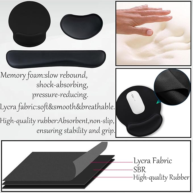 - 【Mouse & Keyboard Wrist Rest】-The wrist rest designed with groove perfectly fits your hand and improves hand and wrist posture,preventing joint and wrist problems,and relieving the stress on your elbows and shoulders.The memory foam,lycra fabric,soft,smooth and breathable material ensures maximum comfort.well press handing process ensures fabric stays with rubber base not easy to separate in long use.