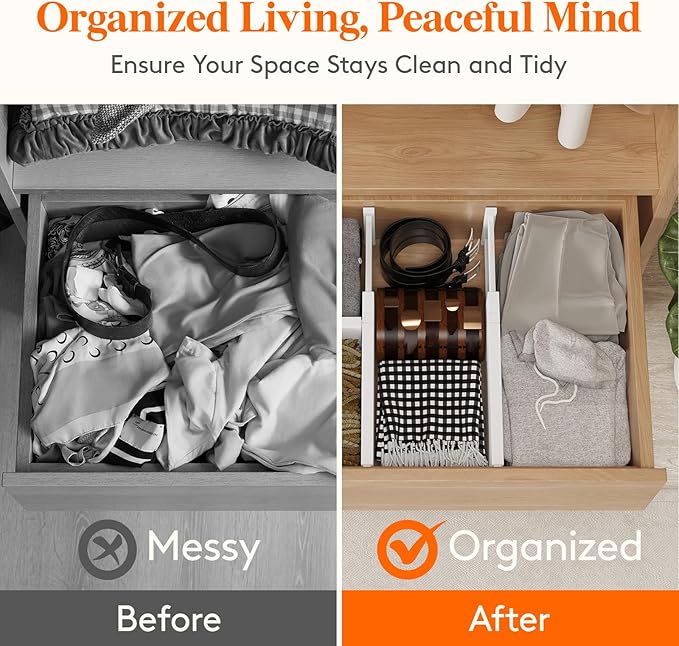- Sturdy Construction: Made of robust ABS material, our dresser organizer features EVA foam sponges on the ends to prevent scratches and damage to your drawerβs interior, ensuring a clean and stable fit without residue; Our divider is patented (Patent No: US12133593B2)