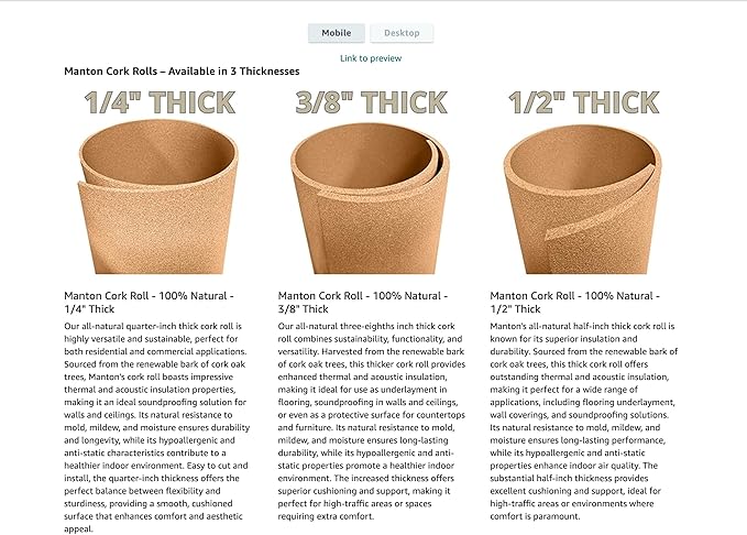 Manton Cork Premium Cork Roll - 4' x 6' x 3/8", 100% Natural Facing Grade Material for Bulletin Boards, Decorative Photo and Message Push Pin Displays - Perfect for Home, School, and Office