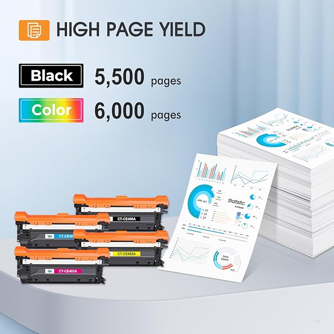 - Page Yield: Up to 5,500 pages for CE400A toner and 6,000 pages per CE401A CE402A CE403A toner (Letter A4, at 5% coverage)