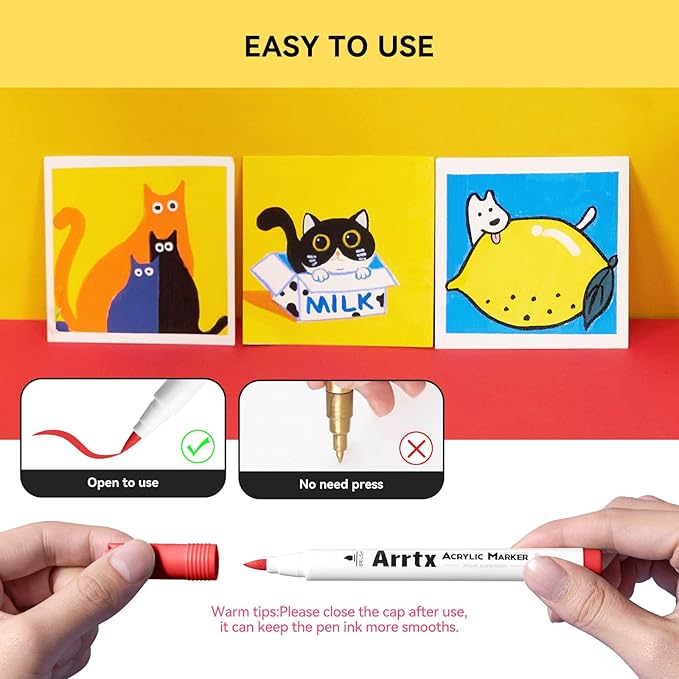 - Quik Dry and Waterproof: The highly pigmented paint is high covering, water-resistant, and abrasion proof allowing the application to any surface. Arrtx acrylic paint pens are water-based ink. These paint markers flow without flooding or jamming, it's permanent when dry. Note: Please tighten the cap and leave the pen with the tip facing down if you don't use them.