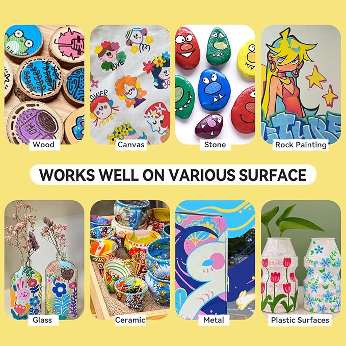 - Suitable for Multiple Surfaces: Arrtx acrylic markers set provides water-based smooth ink and excellent coverage for a variety of surfaces, works for paper, cardstock, metal, rock painting, wood, plastic, canvas, fabric, stone, Easter eggs, easter decoration, metal, Christmas ornament, Halloween pumpkin painting, calligraphy, scrapbook, brush lettering, Christmas card, birthday gifts, greeting card, or any DIY crafts projects and more. Let's express imagination!