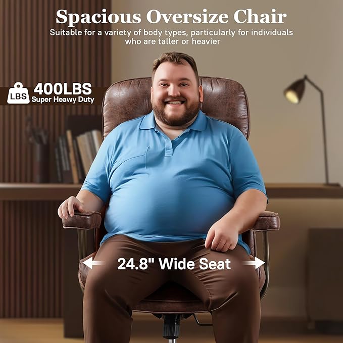 Mid Century Modren Large Office Chair, Big and Tall Ergonomic Executive Chair for Heavy Duty People, Computer Desk Task Chair with Wheels, Faux Lether Fabric Wide Chair for Home Sturdy,Dark Brown