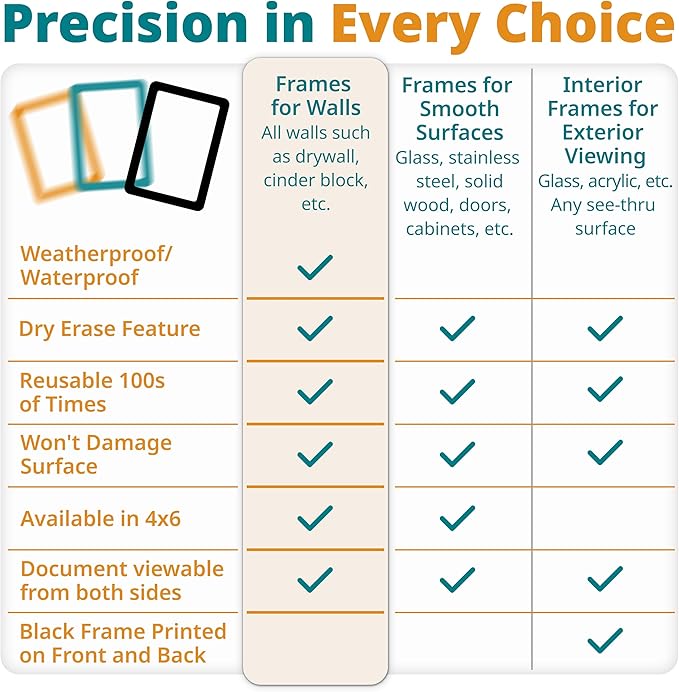 - EASY UPDATES: Skip expensive reprinting with these wall document holders. Simply slide fresh paper into your 8.5 x 11 sign holder when updating menu holders, price lists, schedules, or announcements. The adhesive stays on the frame border only documents never get sticky. This flyer and poster holder system lets you print updates on office paper and have fresh wall sign displays ready in under a minute for businesses changing specials daily.