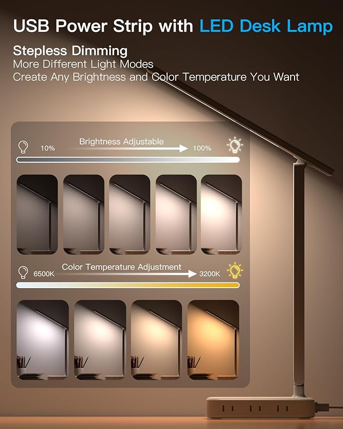 - 【10-IN-1 Deskop Power Strip with USB Ports 】The small desk lamp for college dorm room is also equipped with 2 USB-C port, 2 USB-A ports and 6 AC outlets(Rating:125V 60Hz 15A 1875W MAX), making your phone, tablet, kindle, watch, humidifier and other electronic devices are charged whether the lamp is on or off, building your own working station. Fully save your time and space.