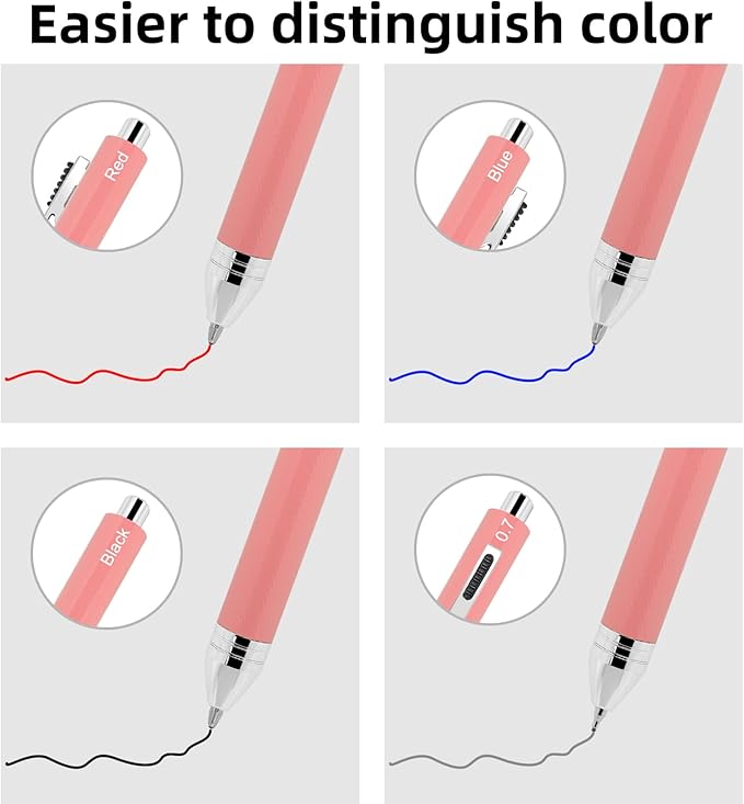 - 3 colors of black, red, blue and 1 mechanical pencil(0.5mm), multicolor pen in one premium -mechanical pencils and pen combo -the best cool multicolor pens. To match the refill, search for ASIN: B0CTQMR99T (Black); B0CTQLVLPJ (Blue); B0CTQMLNMG (Red).