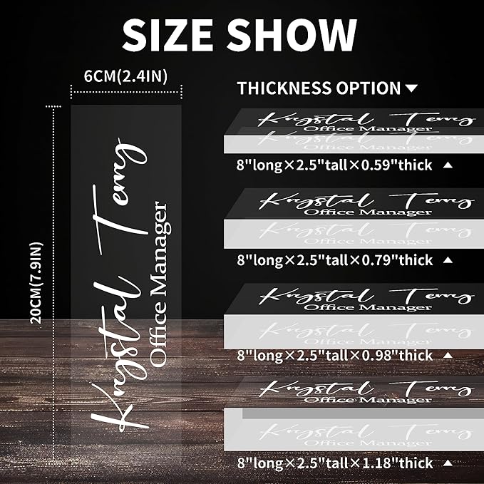 - 【Perfect Office Decor】Desk name plate personalized may be an indispensable item around you. It can be used as decoration for various occasions, such as offices, study rooms, conference rooms, classrooms. It also comes in 4 different sizes, suitable for different office scenarios, Clear 3D effects showcase your favorite fully designs and names, add an extra touch of elegance to your office.