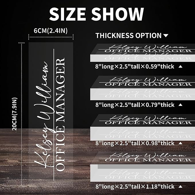- 【Perfect Office Decor】Desk name plate personalized may be an indispensable item around you. It can be used as decoration for various occasions, such as offices, study rooms, conference rooms, classrooms. It also comes in 4 different sizes, suitable for different office scenarios, Clear 3D effects showcase your favorite fully designs and names, add an extra touch of elegance to your office.