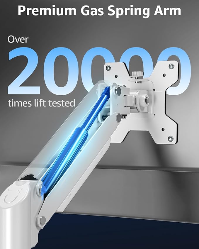 - Smooth Adjustments, No Hassle – Effortlessly tilt, swivel, and rotate your screen for the perfect view. This single monitor mount features a premium gas spring arm, tested over 2,000 times for smooth, durable motion—perfect for multitasking pros and gamers alike.