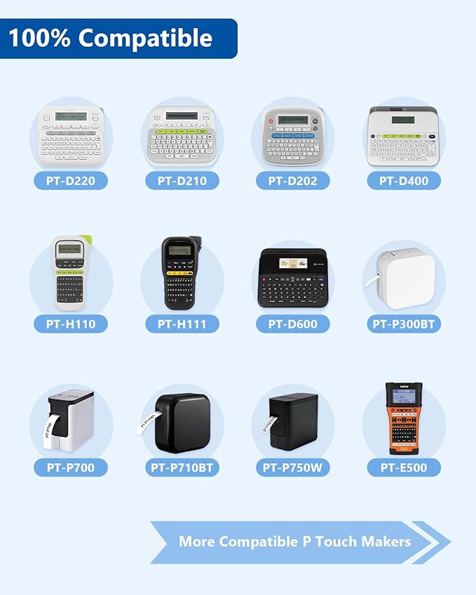 - Compatible with Brother Ptouch Label Maker: PT-D210, PT-D220, PT-D200, PT-H110, PT-D400, PT-D600, PT-H103W, PT-2040, PT-1280, PT-1290, PT-P710BT, PT-D410, PT-D400AD, PT-D460BT, PT-D610BT, PT-1230PC, PT-1890C, PT-1890w, PT-D600VP, PT-2730VP, PT-D201, PT-D202, PT-D215e, PT-E105, PT-E110, PT-E300, PT-H111, PT-P300BT, PT-310BT, PT-1880C, PT-1880SC, PT-1880W, PT-1890, PT-D450, PT-P700, PT-P715eBT, PT-P750W, PT-P910BT, PT-9700PC, PT-2040W, PT-2040SC, PT-2040C, PT-2430PC, PT-2300, PT-E500, PT-E550W, PT-1280SR, PT-2030AD, PT-P910BT, PT-9600, PT-1090 ect