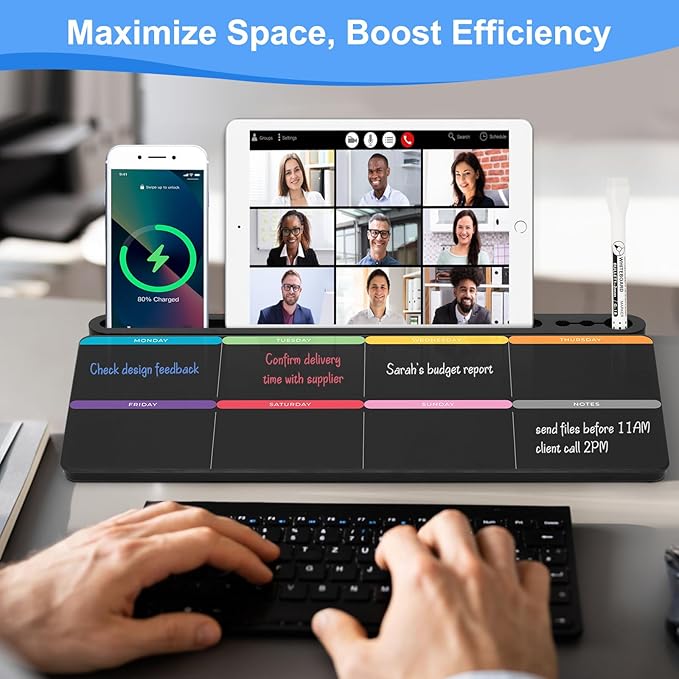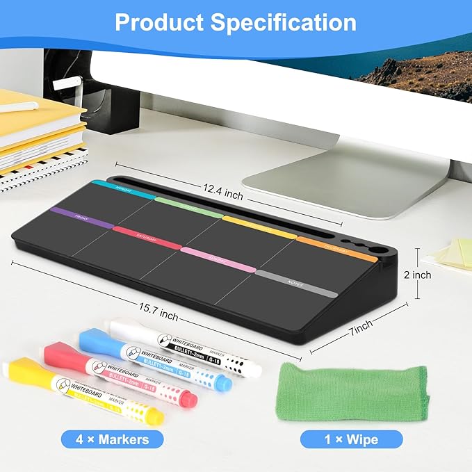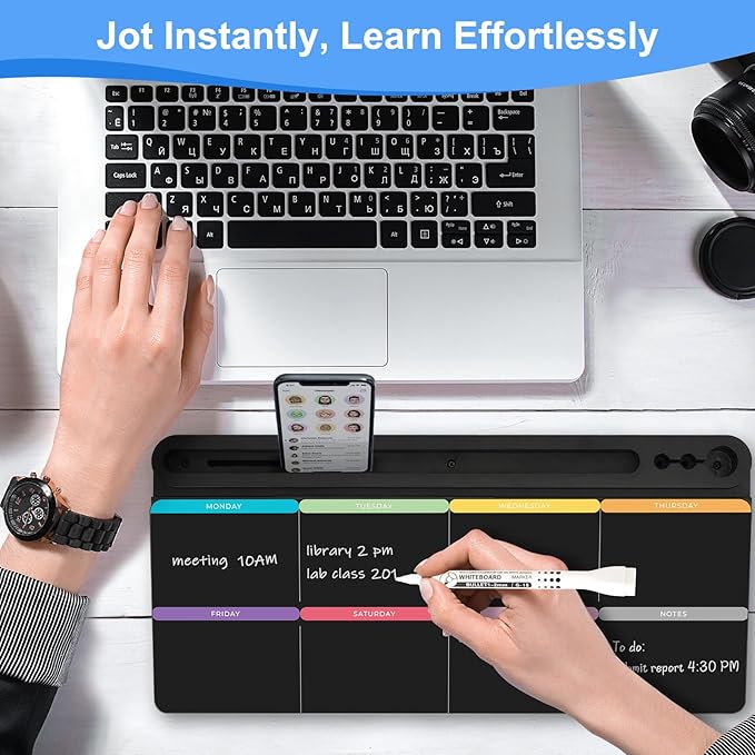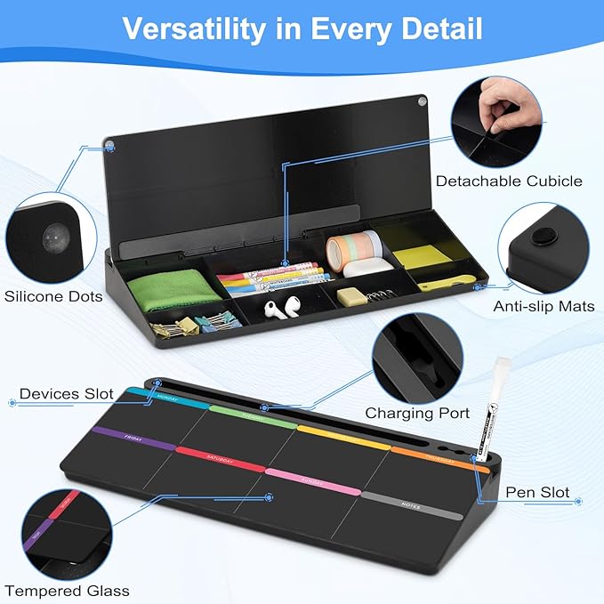 - Weekly Planner Whiteboard - Stay on top of your weekly schedule with ease using our desktop whiteboard. It features a colorful weekly grid with clearly defined sections for each day and notes. Crafted from tempered glass, it offers a smooth writing experience and effortless clean-up—no stains, no scratches. Perfect for organizing tasks, writing to-do lists, and taking quick reminders.