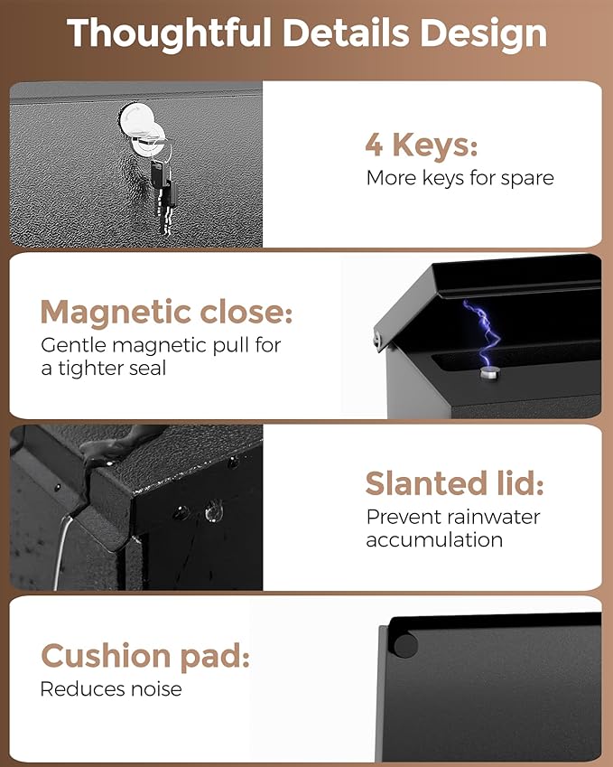 - [Thoughtful Details]: Our mailbox provide you with four keys, no need to worry about keys lost or not enough; the lid is equipped with a black pad, which can be opened and closed quietly; the magnet can make the lid close more tightly through magnetic force, always keeping the contents in the box dry and intact