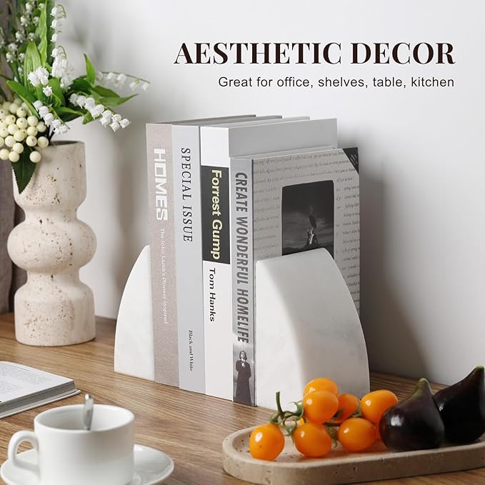 Koville Marble Bookends for Shelves, Large Bookends for Heavy Books, Natural Stone Book Stopper for Books CD Movies, Aesthetic Decorative Book Ends (White)