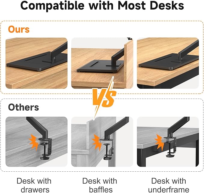 - No Drilling Required - Unlike C-clamps or grommet bases, the freestanding desktop monitor stand utilizes a large wooden base that requires no drilling for installation and will not damage your desktop. Simply place it on your desk for flexible adjustments and movement for a more comfortable workspace.The freestanding monitor mount base measures 53.5 cm(L) x 33 cm(W) and features bottom side padding.