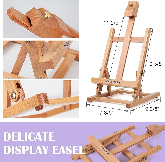 - Sturdy Table Easel: Falling in Art table easel is made with durable beech wood, and no assembly is needed. You can use it with no worry about it breaking or falling apart. It can be folded and can be used as a stand for painting or a display easel for prints, iPad, and canvas