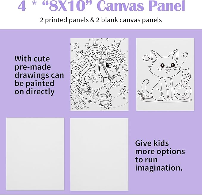 - Versatile Art Supplies: There are 2 panels printed with pre-made drawings, and 2 blank ones give kids more options to run their imagination. Multi-shape paint brushes are carefully crafted to deliver precise strokes. Non-toxic acrylic paints with excellent coverage are easy to mix and can be used on multiple surfaces