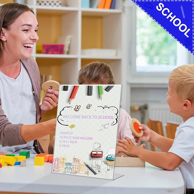 Acrylic Sign Holder 8.5" x 11" - 6 Pack Clear L-Shaped Tabletop Menu Frame for Restaurants, Photos, Posters | Slanted Back Design | Durable Promotional Display Stand