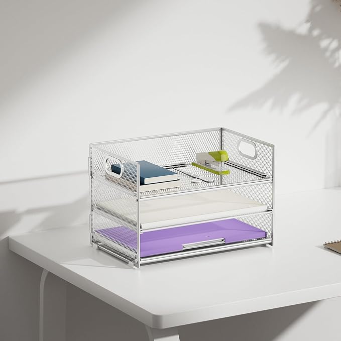 Marbrasse 3 Tier Paper Organizer Letter Tray, Mesh File Organizer with Handle, Paper Sorter Desk Organizer for Home Office Supplies - Silver