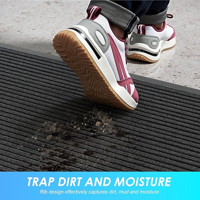 - Capture Dirt and Moisture:The heavy-duty door mat super absorbent, featuring a deep-grooved stripe design of door mat on the surface effectively captures dirt, dust, sand, and moisture and other clutter. The sturdy rubber edge will not accumulate water. Even rainy, snowy weather will keep your home dry and clean.Making it an excellent choice as a front door mat indoor and outdoor.