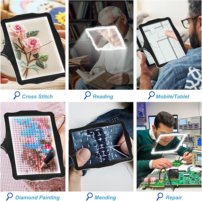 - 【Hands-Free Illuminated Magnifier】Illuminated magnifier with stand, built-in 48 super-bright LED beads, provides three levels of brightness adjustment (low/medium/high), which can be switched freely according to ambient light and task requirements, professional light-guiding technology achieves uniform lighting, and evenly distributed light can reduce eye fatigue, effectively eliminate shadows and glare, ensure comfortable and long-lasting use, without glare or flicker, and is an ideal choice for professionals, enthusiasts and the elderly.