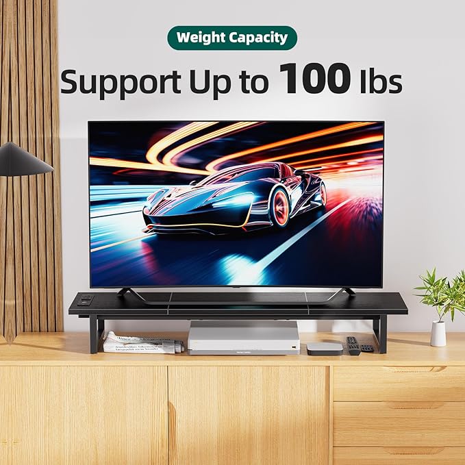 Simple Trending Dual Monitor Stand Riser with 2 USB Charging Ports, Computer Desk Organizer for 2 Monitors, Extra Long TV Stand for Laptop Office, iMac, Black