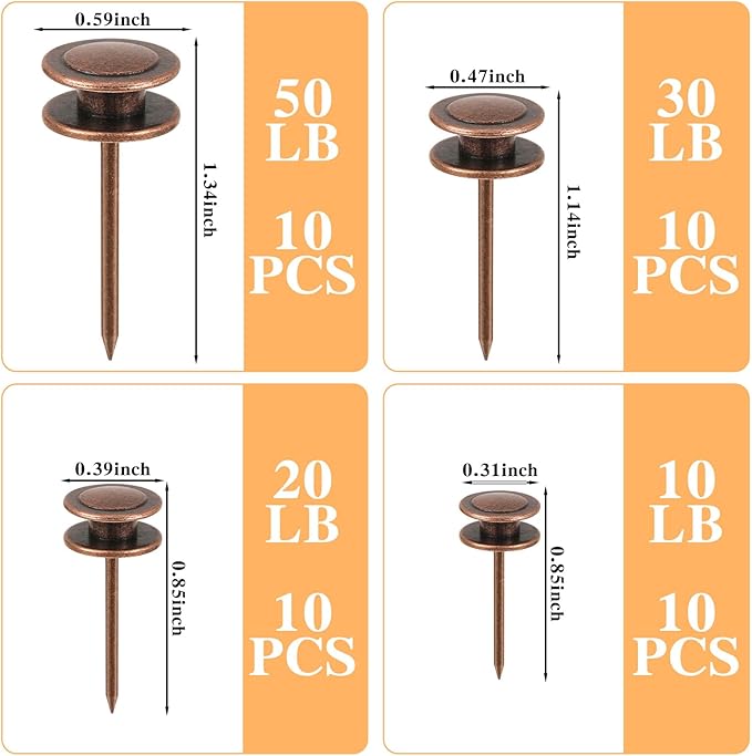 Ferraycle 40 Piece Double Headed Picture Hangers Nails 4 Size Long Thumb Tacks for Wall Hanging Decorative Nails Push Pins Picture Hooks for Drywall Photo Decor, 10/20/ 30/ 50lb(Red Antique)