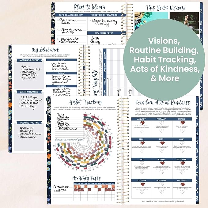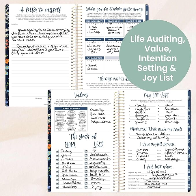 - BONUS CONTENT: Packed with life coaching worksheets and inspirational features to help you set and achieve all of your goals for the year: personal mission statement prompt and yearly goal setting page, weekly scheduling templates, values page, habit tracking, vision board, monthly spending log, 16 notes pages, motivational quotes, monthly challenges, and more!