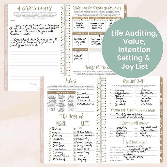 - BONUS CONTENT: Packed with life coaching worksheets and inspirational features to help you set and achieve all of your goals for the year: personal mission statement prompt and yearly goal setting page, weekly scheduling templates, values page, habit tracking, vision board, monthly spending log, 16 notes pages, motivational quotes, monthly challenges, and more!