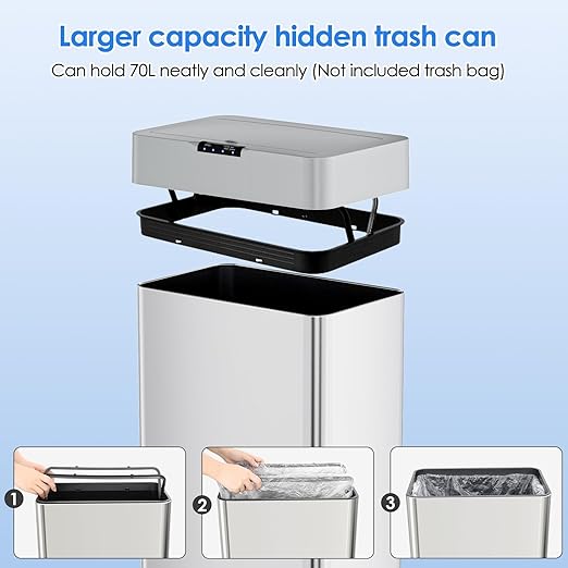 - LARGE CAPACITY&410 STEEL: 18.5/21.1 gallons garbage can fits bathrooms, living rooms, bedroom and more. Efficiently manages daily waste, maintaining tidiness. And made of 410 stainless steel, brushed surface, automatic trash can is also fingerprint-resistant.