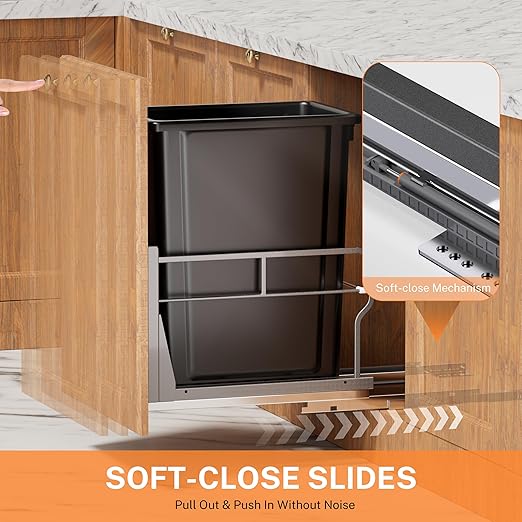 - Smooth Sliding Trash Can: Under cabinet trash can pull out with a soft-close mechanism, allowing the waste container to fully extend outside the cabinet for easy access. Continuous bearings ensure smooth and quiet operation, reducing noise during opening and closing for a more peaceful home environment.