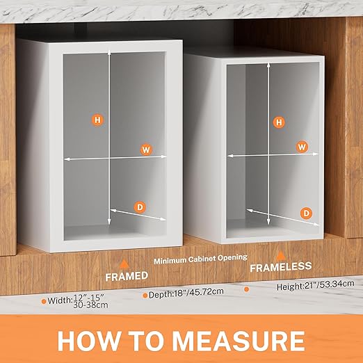 - Minimum Cabinet Size Required: 12" -15" W x 18" D x 21" H. Trash can specifications: 10.6" W x 16" D x 20" H. Designed for base cabinets with openings at least 12" -15" inches wide. The door mounting kit is mounted to the front of the slide frame on both sides and requires a separate tool to remove.